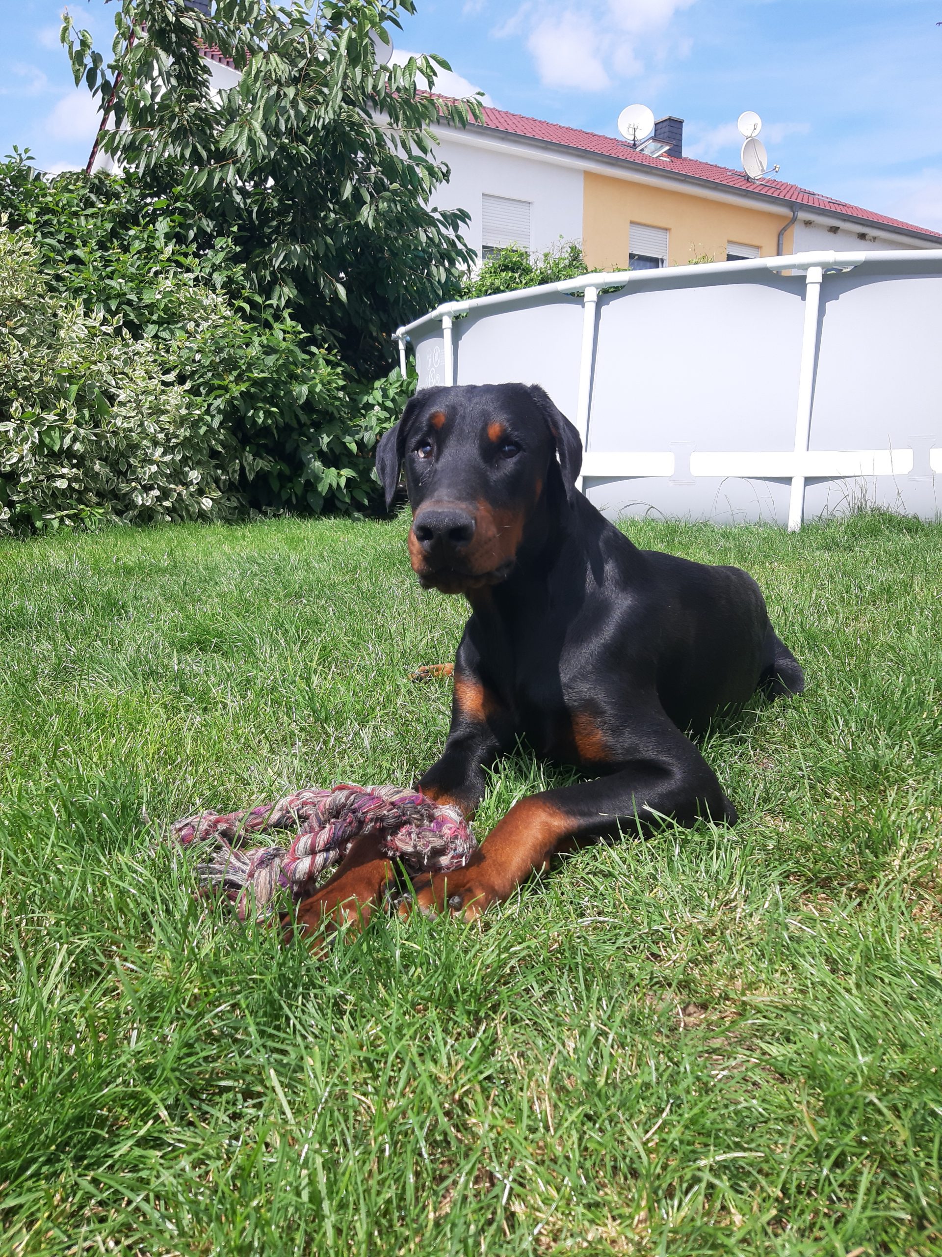 Unser bisher jüngster Pflegehund. Ein Traum von einem Dobermann, der offen und interessiert durchs Leben geht. Er ist mit Artgenossen und Katzen verträglich und sehr menschenbezogen. Natürlich muss er noch viel lernen – aber mit ihm macht alles Spass 🙂